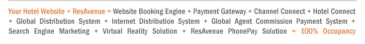 Your Hotel Website + ResAvenue = Website Booking Engine + Payment Gateway + Channel Connect + Global Distribution System + Internet Distribution System + Global Agent Commission Payment System + Voice Reservation Services + Search Engine Marketing + Virtual Reality Solution + Travel referal Services + ResAvenue PhonePay Solution = 100% Occupancy